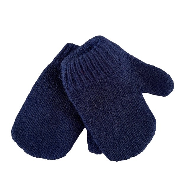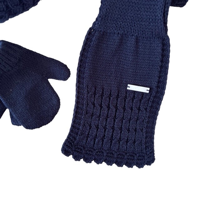 Conjunto de boina, manopla y bufanda en color azul marino.