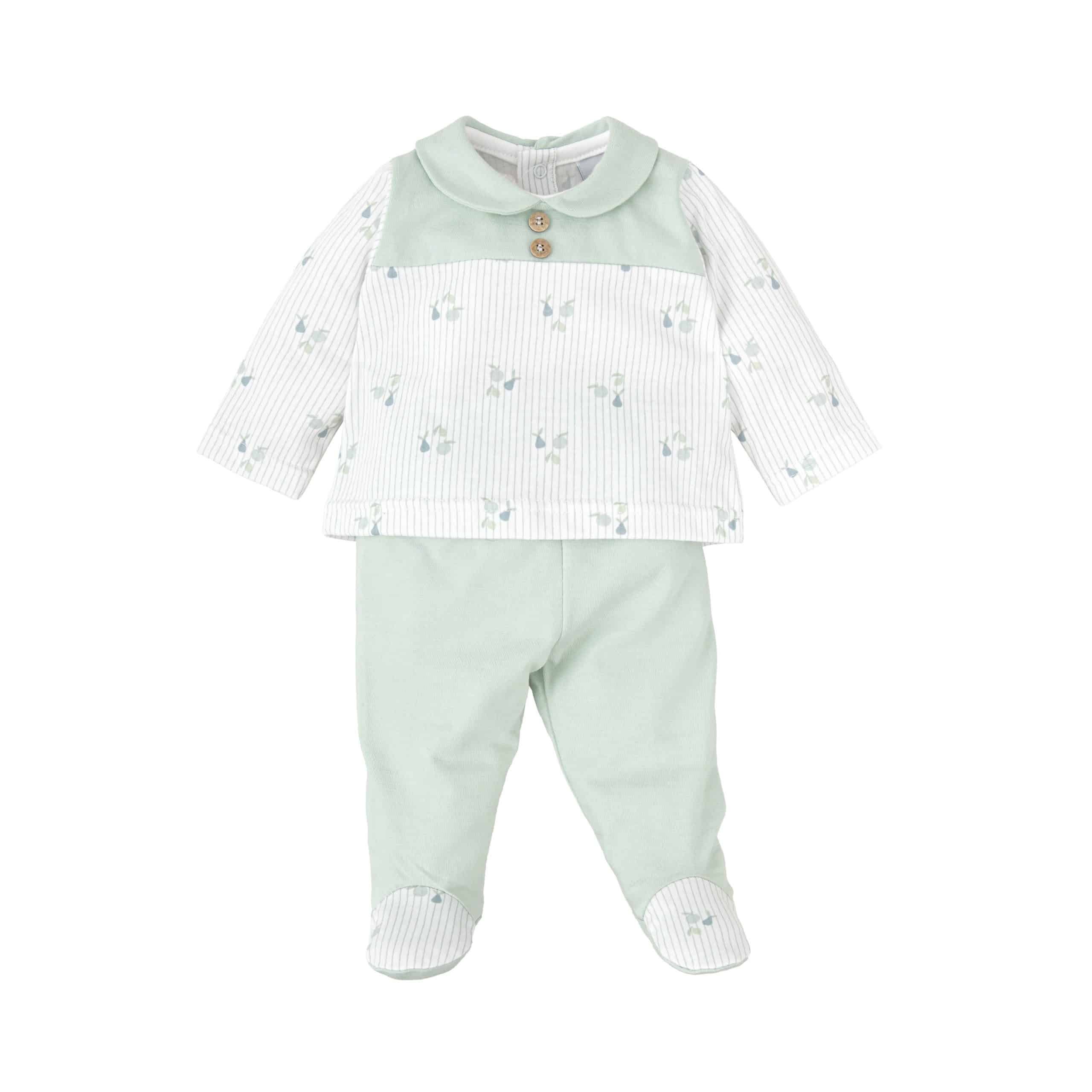 Conjunto ideal para la primera puesta de tu bebé. Con un tejido de algodón 100% super fresquito para los meses de primavera y verano.