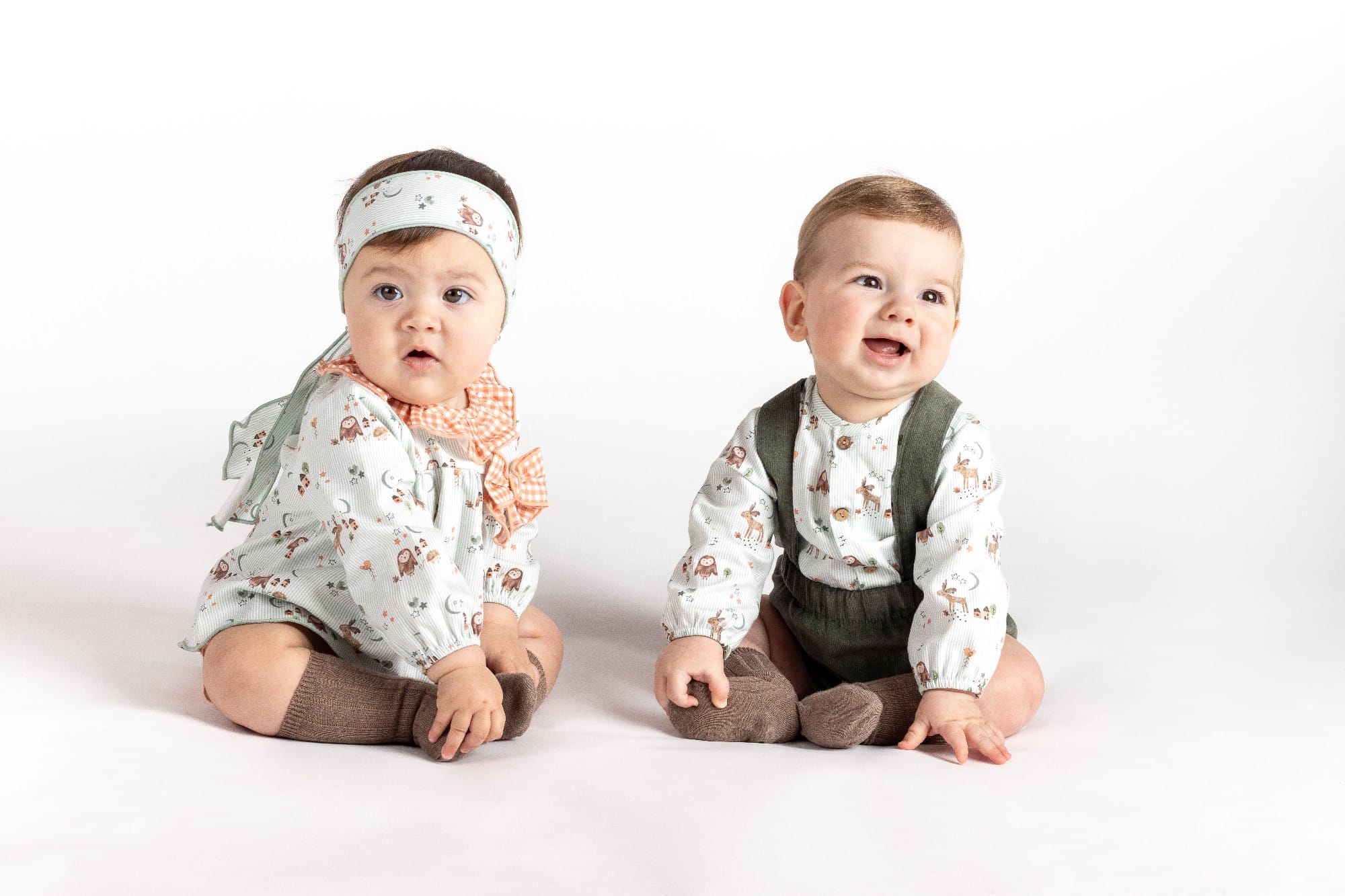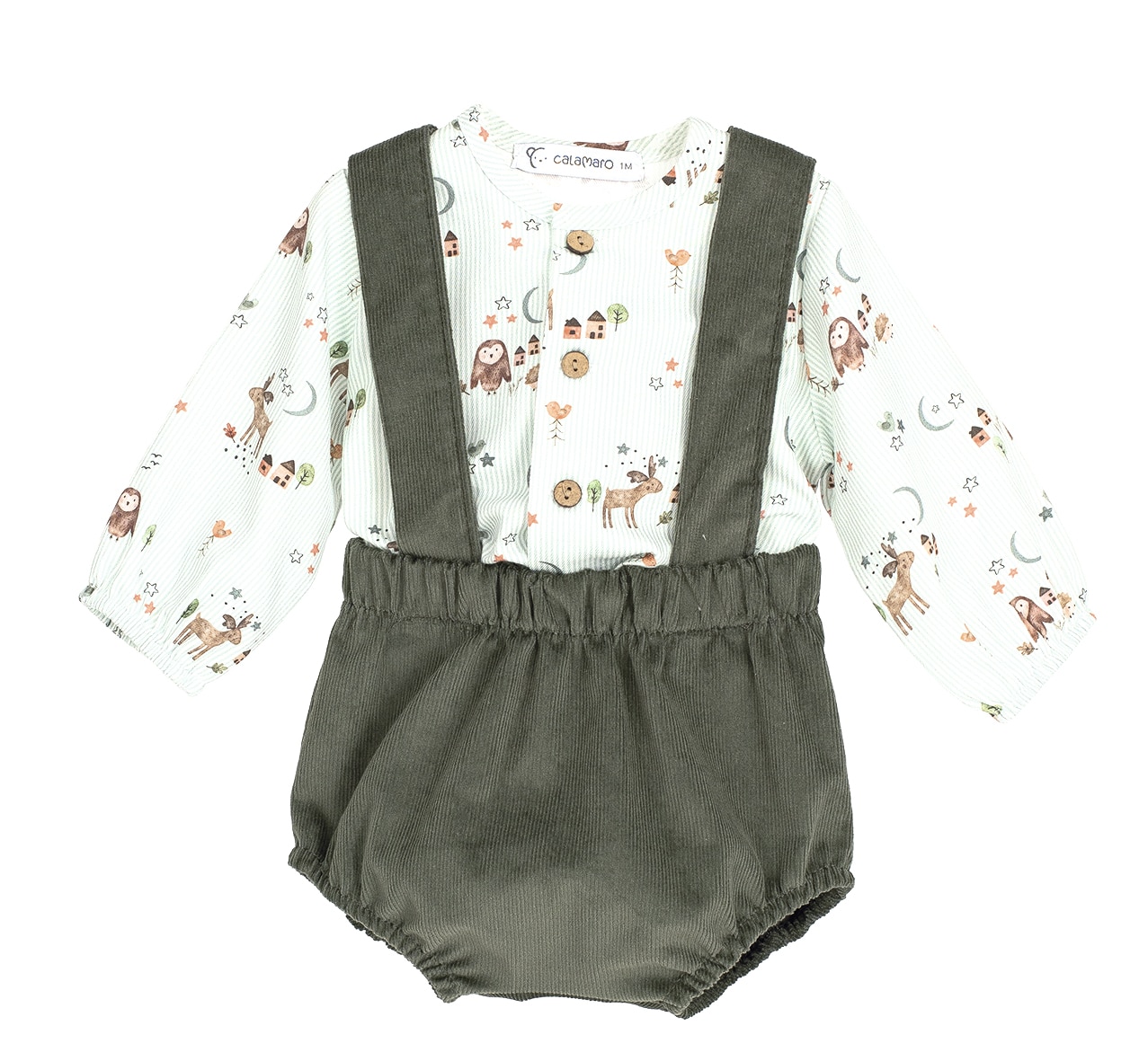 Camisa de color blanco con estampado de rayas en color verde mint y estampado de renos. Apertura delantera con botones madera.