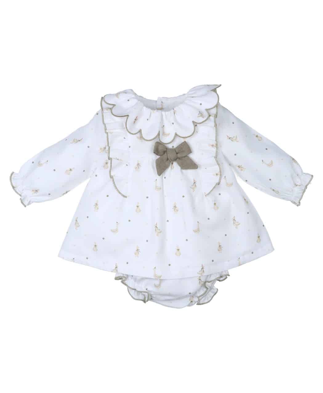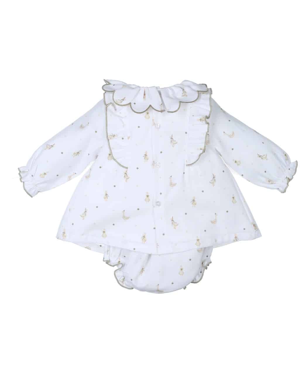 Jesusito de color blanco con estampado de patitos en color verde oliva.