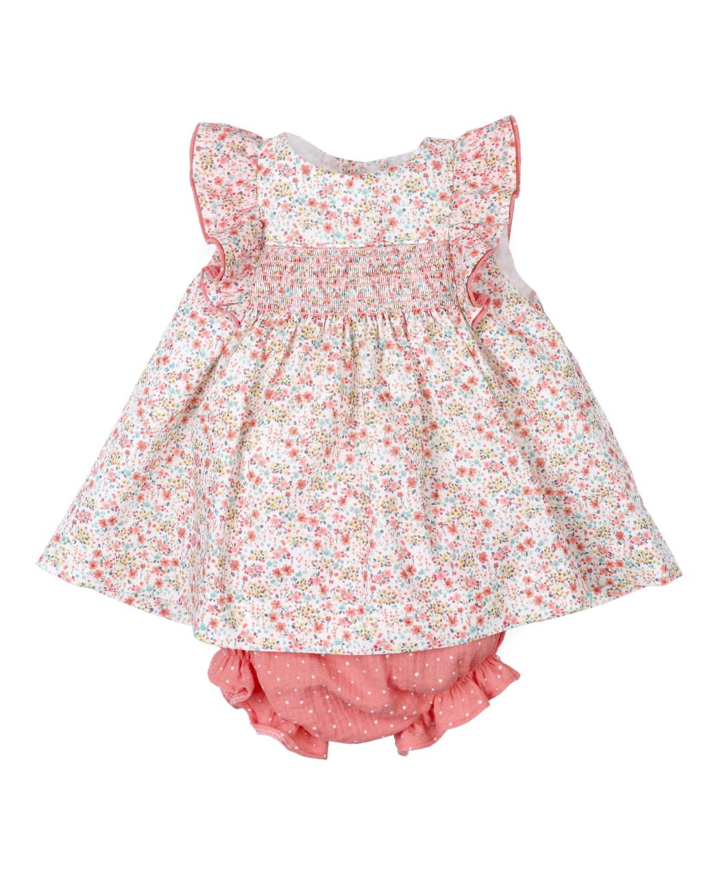 Jesusito 100% algodón con estampado de flores liberty en color coral. Detalle nido de abeja en el pecho y volantes en los hombros.