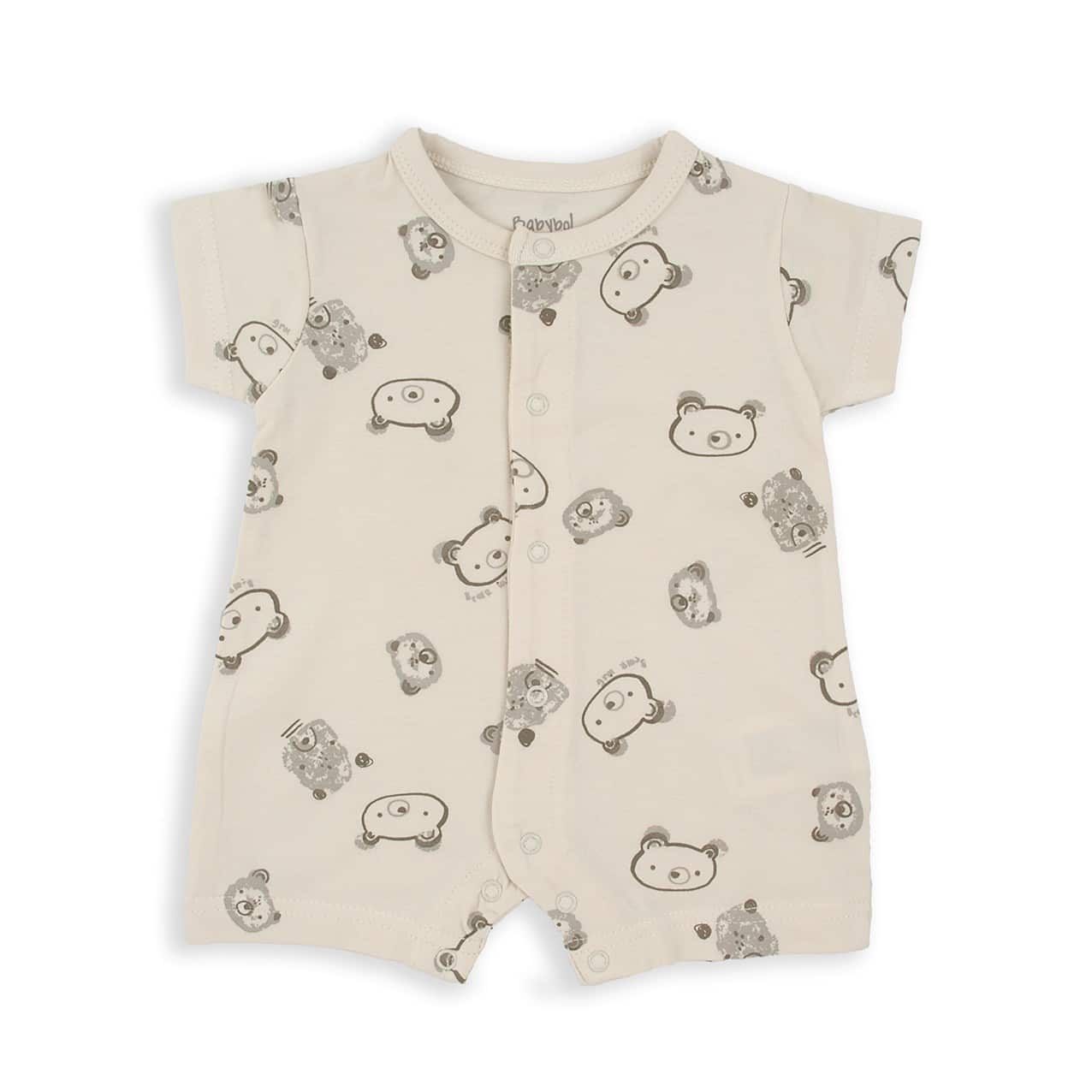 Pelele 100% algodón de manga corta con estampado de ositos en color beig. Apertura completa con corchetes automáticos en la parte delantera e inferior.