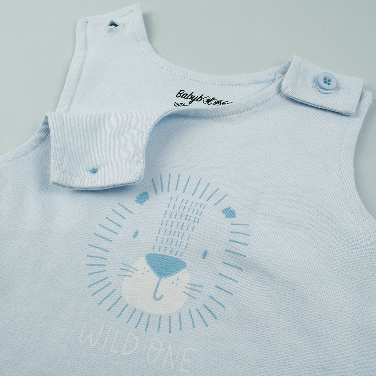 Pelele desmangado 100% algodón en color azul celeste y estampado león