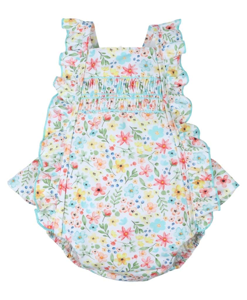 Pelele volantes de hilo perlé con detalles calados y lazo estampado con flor liberty.