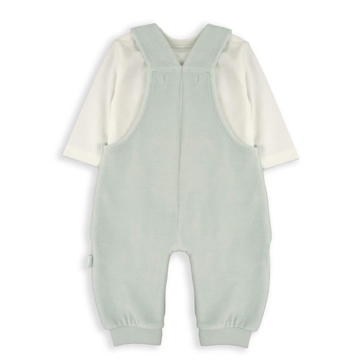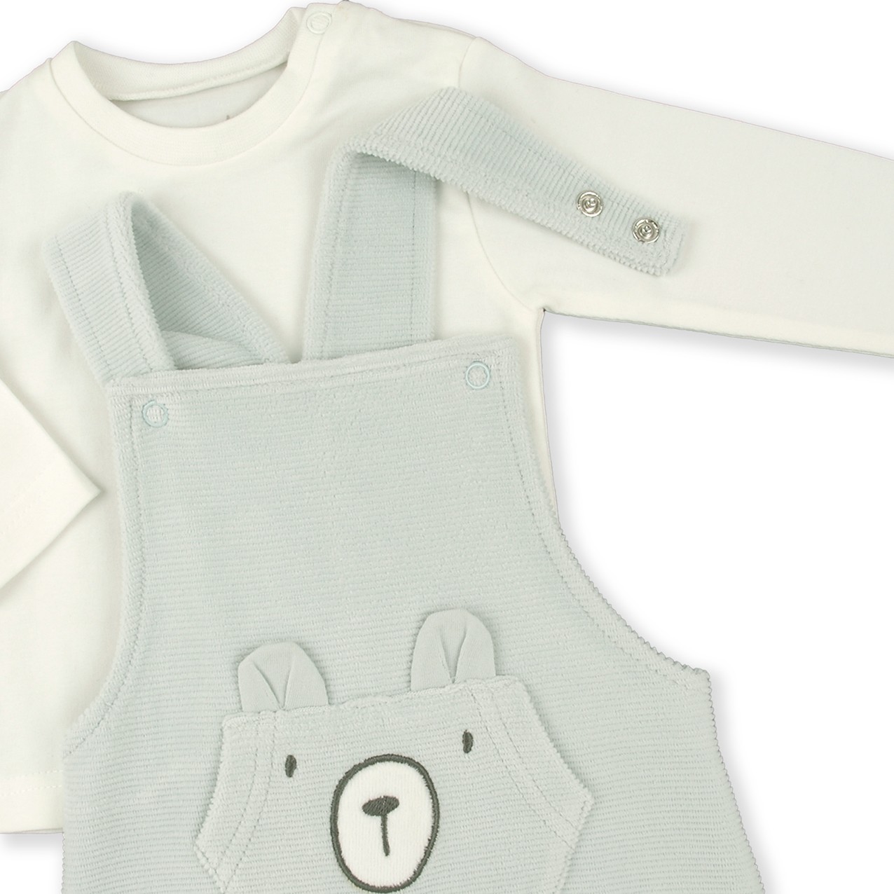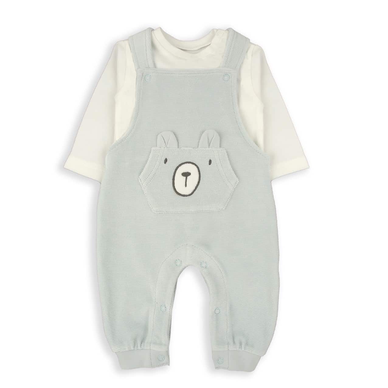 Pelele de terciopelo en color verde menta con detalle osito bordado. Apertura en los tirantes y la parte inferior.