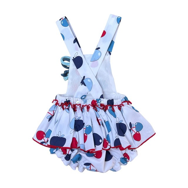 Pelele 100% algodón de color blanco con estampado de cerezas en color azul.