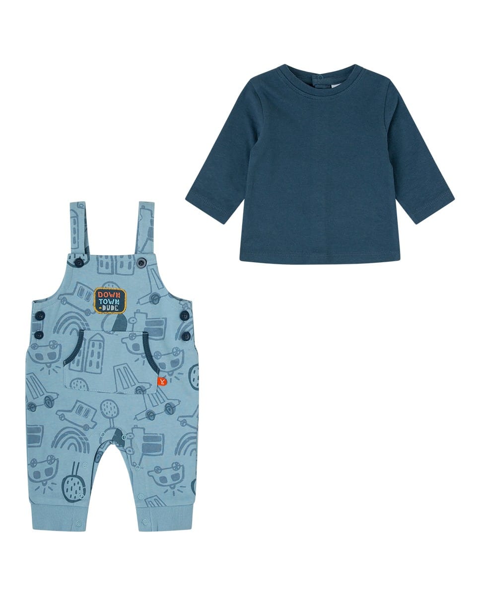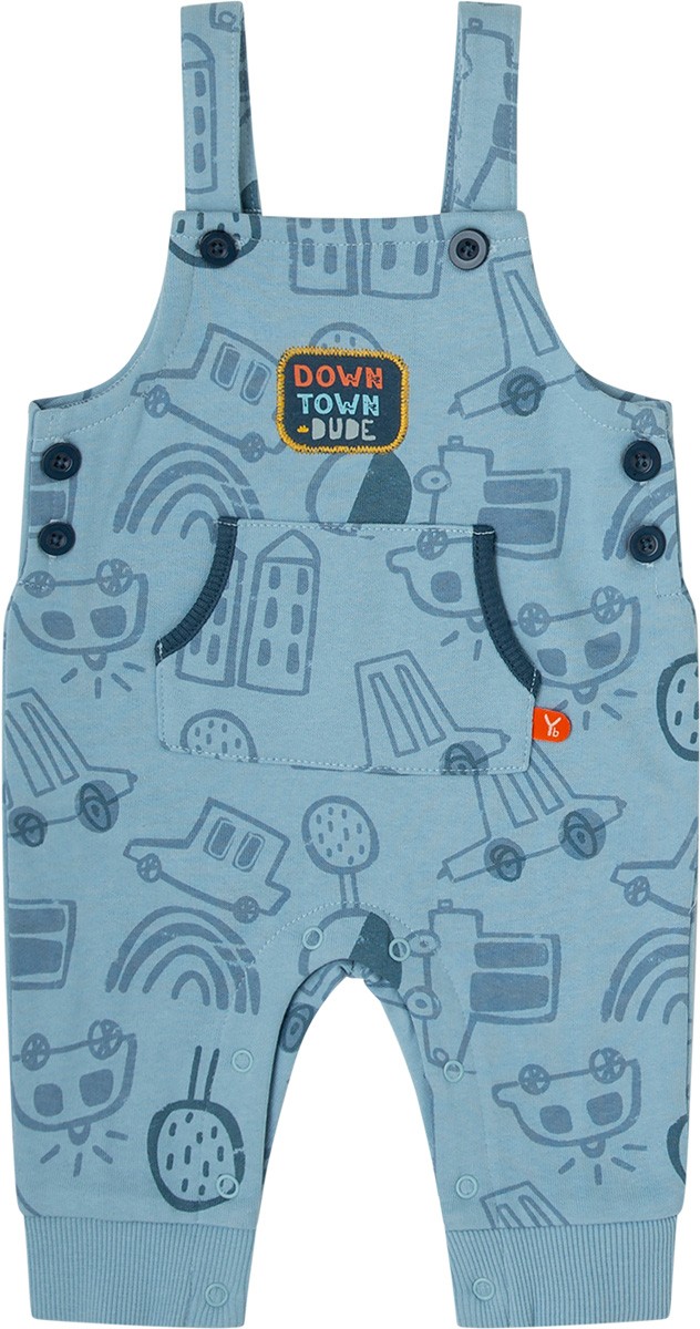 Peto 100% algodón con interior afelpado en color azul con estampado de coches. Apertura en la parte inferior y los tirantes.